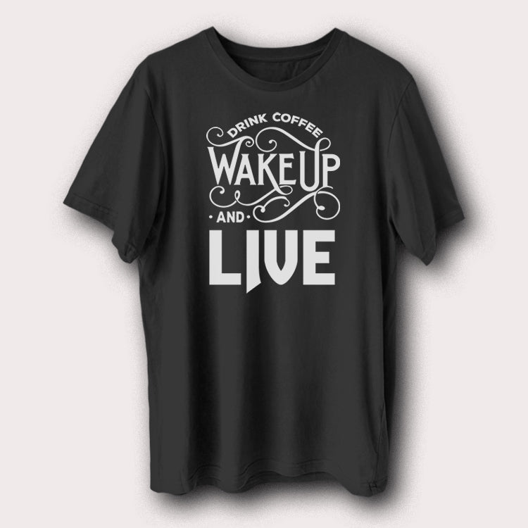 This men's t-shirt features a bold "Drink Coffee Wake Up And Live" design, perfect for coffee enthusiasts. Made with comfortable fabric, it’s ideal for daily wear, combining style and passion for coffee in a practical, durable tee.